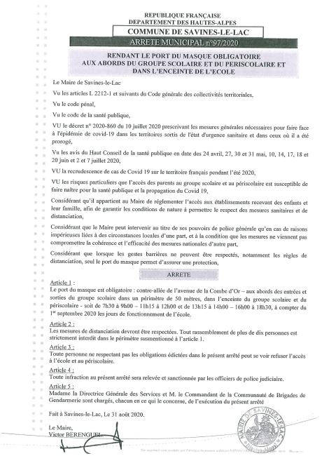 Par arrêté Municipal n° 97/2020 Monsieur le Maire rend obligatoire le port du masque aux abords du Groupe Scolire, du Périscolaire et dans l'enceinte de l'école.